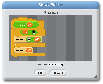 | This was to illustrate the use of a conditional (the if statement) in the solution, along with using report blocks rather than the default report slot. There are several ways to do this, and students in the class selected the if-then-else block - you could also have used the plain "if" block, and put "pX" into the default report slot. (Note: There is a block provided by BYOB that reports the absolute value of its parameter, but that's not the point - the point is to see how such a block could be implemented.) |