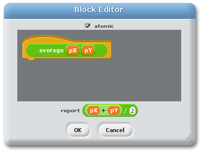 | This was a really simple problem, and just required putting the formula to average two numbers into the "report" slot of the block editor. The main point of this example was to demonstrate different scopes of variables, and to introduce the naming conventions that we'll use in this class: parameters start with the letter p followed by a descriptive name (and script variables will start with an s followed by a descriptive name). |