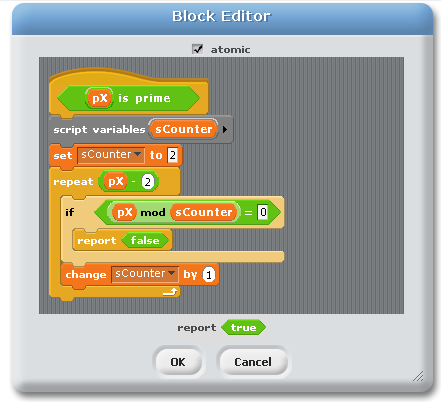 | Important points with this example: it's a predicate block, and uses a very common pattern for iteration. When checking if a number "pX" is prime, we need to check whether any of the numbers in the range [2,pX-1] divide evenly into pX. If any of them do, it's not prime; otherwise (if none of them do), it is prime. We know exactly how many values are in this range (it's pX-2), so we repeat that many times, and we have a script variable "sCounter" that counts up - it takes the value 2, then 3, then 4, then 5, ... We initialize sCounter to its first value (2) before the repeat loop, and increment it (change it by 1) as the last thing inside the repeat loop. This is at least the third time you have seen this pattern of loop in this class - and it won't be the last! (Note: There are efficiency improvements that can be made here - don't assume that this is the best way to test whether a number is prime!) |