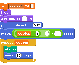The only thing tricky with this script is the formula in the "move" block right in the middle. It's important to know that the sprite we're working with is Alonzo, and Alonzo is 104 pixels wide - so at 50% scale, he's 52 pixels wide. We have this 52 hard-coded into this script in two places, and those would have to change if we used a different sprite (unfortunately, there's no easy way in BYOB to determine the width of a sprite other than to look at the costume and hard-code the width from that). To understand the formula, think how you far you need to move to the left in order for the stamped sprites to be centered. Let's think about a few examples: