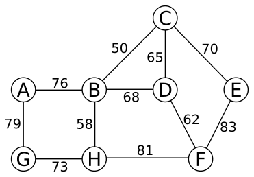 The input to the traveling-salesperson problem is a complete weighted graph, which is difficult to draw when there are more than 5 vertices. However, consider the following weighted graph, and then imagine that we create the graph \(G\) by “completing” the edge set by adding every missing edge with a weight of 100. So, for example, there are edges \((A,C)\), \((A,H)\), \((B,F)\) and so on, all with weight 100.