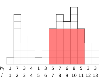 Because of your great success in helping ArachnidMan, some of the city’s supervillains would like to hire you to solve some of their problems too. A villain named Clandestine has asked you to help locate a hidden lair. Clandestine can’t hire an architect, so the lair must be a simple rectangle, and the goal is to hide it entirely behind the skyline so it can’t be seen (obviously, you can only look at the city from one direction). Your goal is to write a program to determine what the largest possible lair is. For the skyline above, this is illustrated below, where the largest lair is shown in light red.