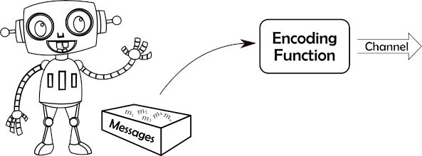 The question of encoding is very involved, and we can encode for a variety of goals: in data compression we want the most compact encoding; for reliable transmission we see how to add extra information to support error detection or correction; and for secret communication, we want to make the encoding unintelligible to an eavesdropper. For now we focus just on how messages are selected, not how they are encoded.
