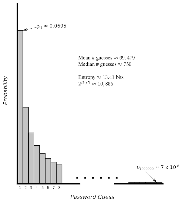While the previous paragraph gives a believable story of why English language keys are bad, we glossed over one point: Is a key drawn from a source with entropy \(h\) bits really the same as a key drawn from a \(h\)-bit uniform distribution from a security standpoint? In other words, how closely does entropy correspond to security? We’ll explore this question in the rest of this section, switching terminology to searching for a password rather than a key since human-selected passwords have more difficulties than randomly-selected keys.